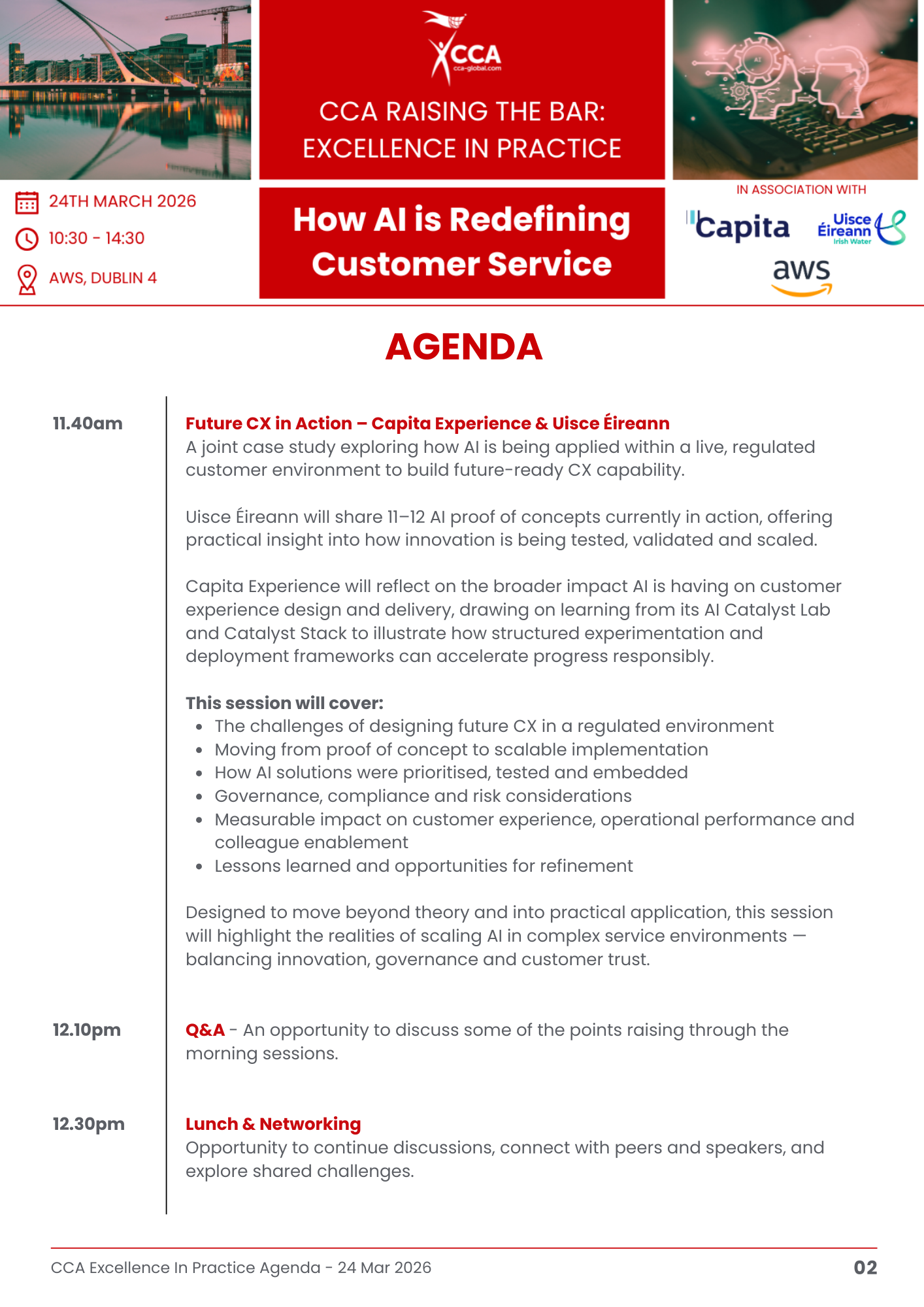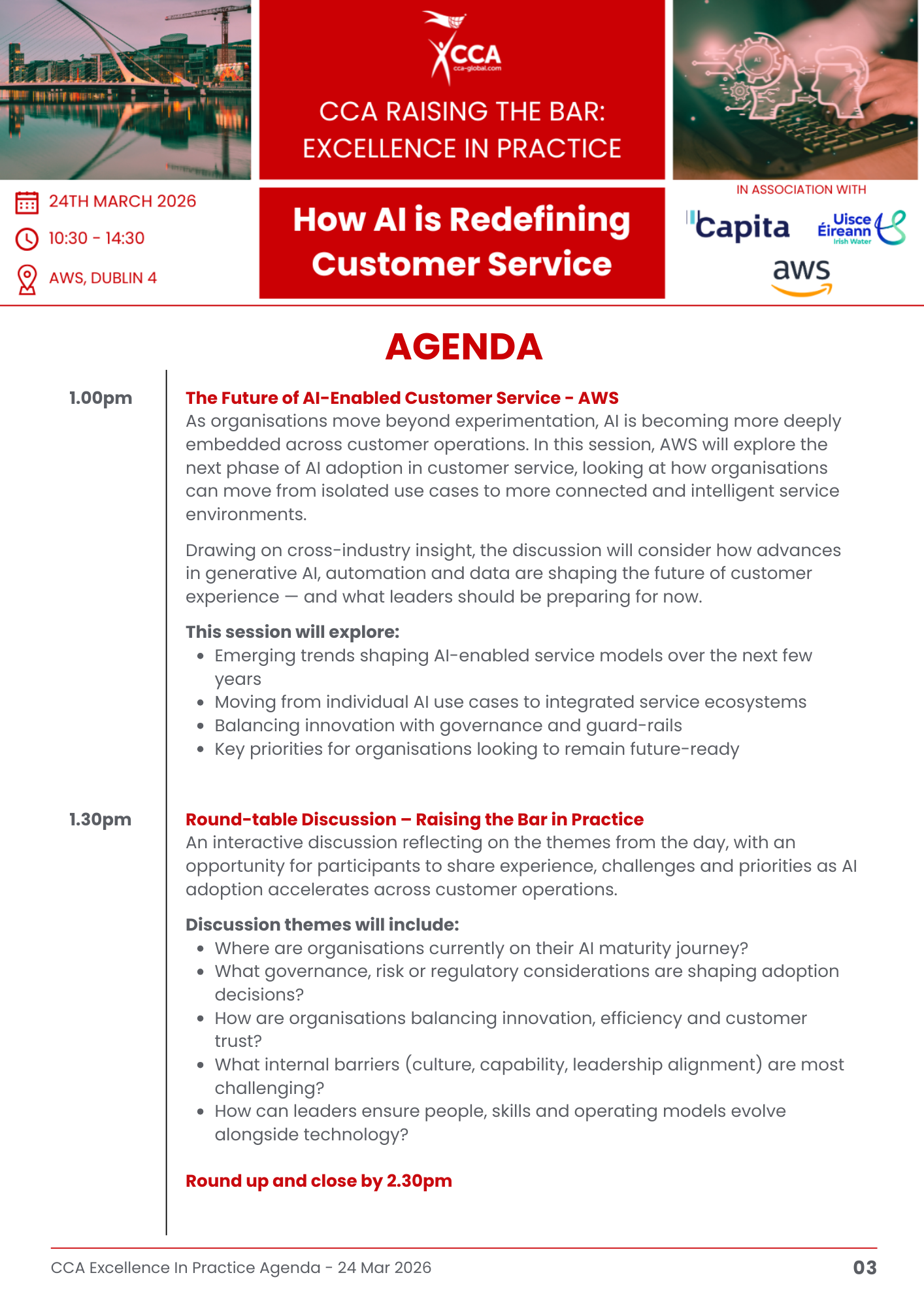 The session will feature a joint case study from Capita and Uisce Éireann, offering real-world learning on how AI is being applied to service challenges; from enhancing customer and colleague experience to improving efficiency and performance. AWS will also showcase the latest AI capabilities being deployed across customer environments, highlighting both innovation and practical application.